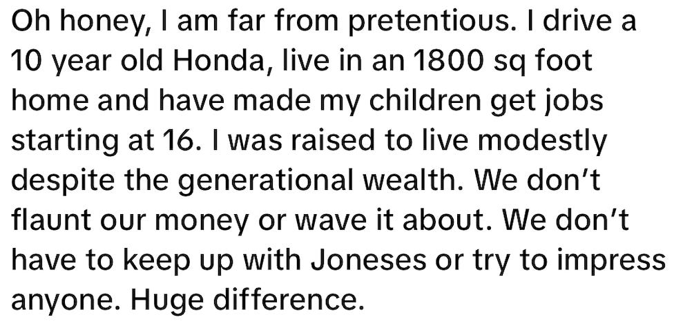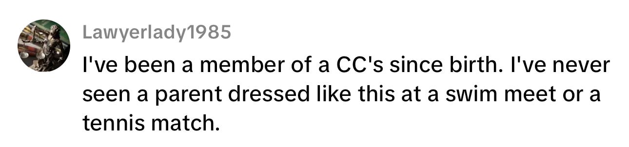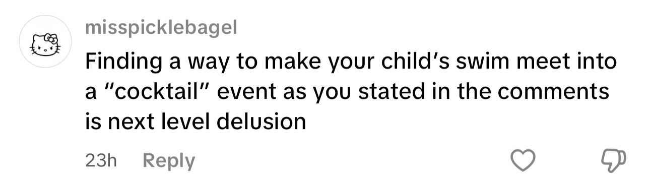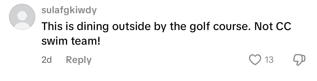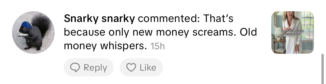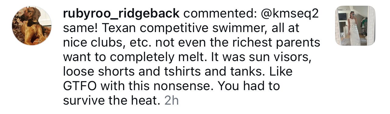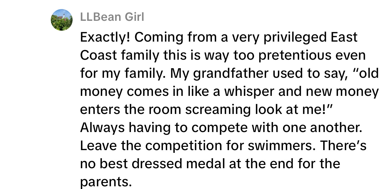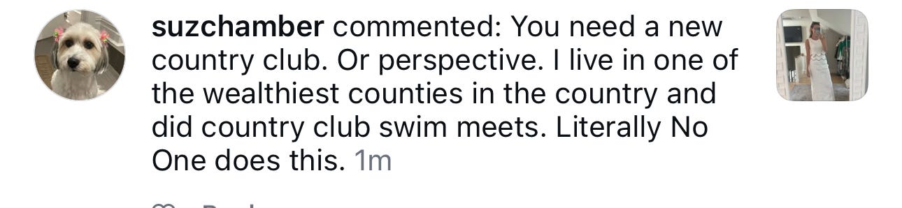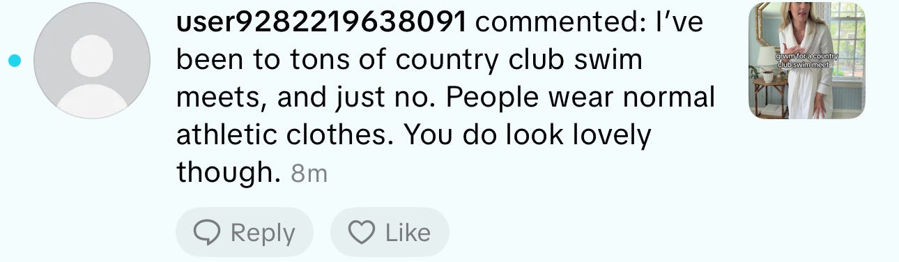 Anyway, it spun out of control and all of the sudden, LL Bean Girl is telling me how modestly she lives because she is old money and wealth whispers yet belongs to the world’s most exclusive country club yet I am a bad parent for wearing a linen skirt set to a kid’s summer swim meet and I’m sure I left something out. I literally do not understand how this reel got to be about old money vs new money vs neglectful parenting when a simple “wow, I perceive you to be overdressed for such an event” would have sufficed.
