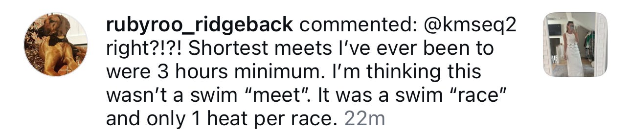 I’m sure I’ll never know the answers to the above but you can count on me generally avoiding athleisure and sometimes overdressed at certain events. (Should I tell swim community now that even when I volunteer at all day meets I’m usually in jeans?! Maybe don’t). And guess what—the kids are fine with it.